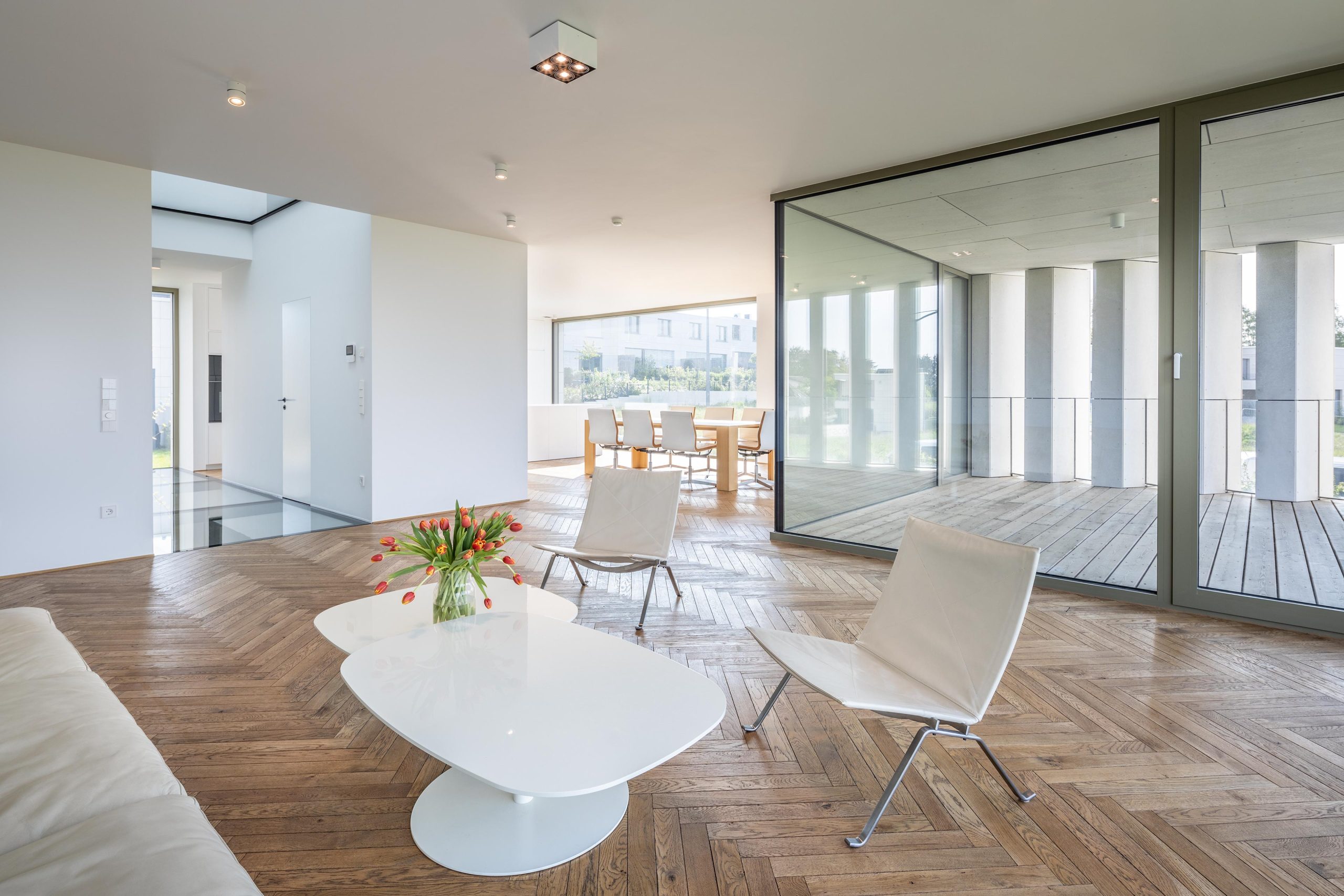 Le véritable défi de cette construction résidait dans sa capacité à magnifier la lumière naturelle. Chaque détail a été minutieusement étudié pour permettre à cette lumière d’inonder généreusement les espaces intérieurs. Une généreuse verrière en toiture capte les rayons du soleil, tandis que des dalles en verre judicieusement réparties sur chaque niveau de vie permettent à la lumière de se faufiler jusqu’à l’entrée, deux étages plus bas. Les ouvertures généreuses surplombent la piscine et le jardin, créant ainsi des perspectives vers l’extérieur et un lien fusionnel avec la nature environnante, tout en préservant l’intimité des occupants, tant à l’intérieur qu’à l’extérieur de la maison.