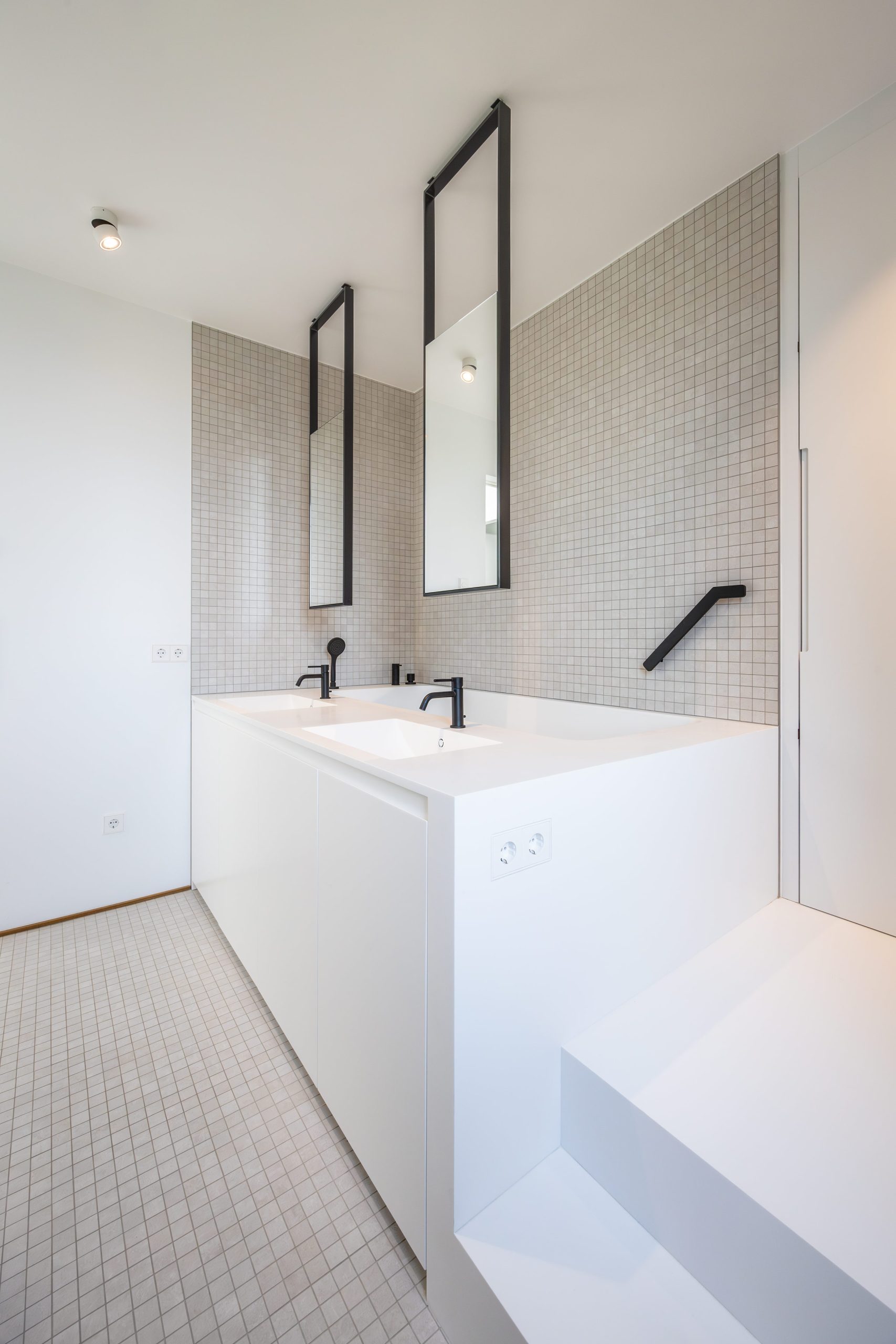 Chaque élément, des meubles de salle-de-bain à l’aménagement sur mesure de la piscine, a été conçu dans la plus grande sobriété et pureté.